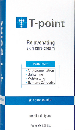 EN - T-point Rejuvenating Skin Care Cream, helps skins with spots and color tone unevenness to protect the natural color of the skin, to reestablish the vital appearance and to prevent the formation of new spot by means of strong actives in its content. With its strong active composition of natural moisturizers, celi nutrients, anti-oxidants and skin renovators, it strengthens the skin barrier and renews it. İt regulates the appearance of sun spots, aging spots and acne scars on the skin. Apply as a thin layer on regions with aging and spotting problems until the product is completely absorbed with a gentle massage. Use twice a day, morning and evening, and regularly. Keep at room temperature and out of reach of children. Use it after testing on a patch inside the wrist.